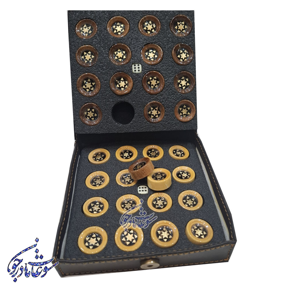 - شامل ۳۲ عدد مهره سفید و سیاه و دو تاس در یک جعبه چرمی