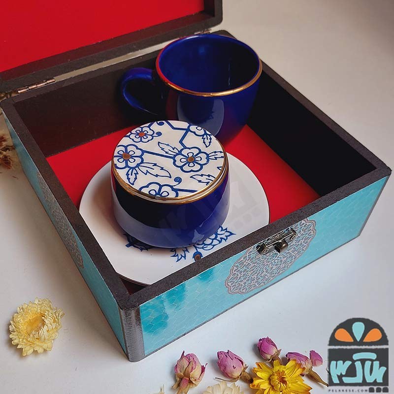 تمامی این محصولات داخل یک باکس شکیل با روکش پارچه سنتی قرار گرفته اند که جلوه ای لوکس و رسمی به هدیه می دهد.