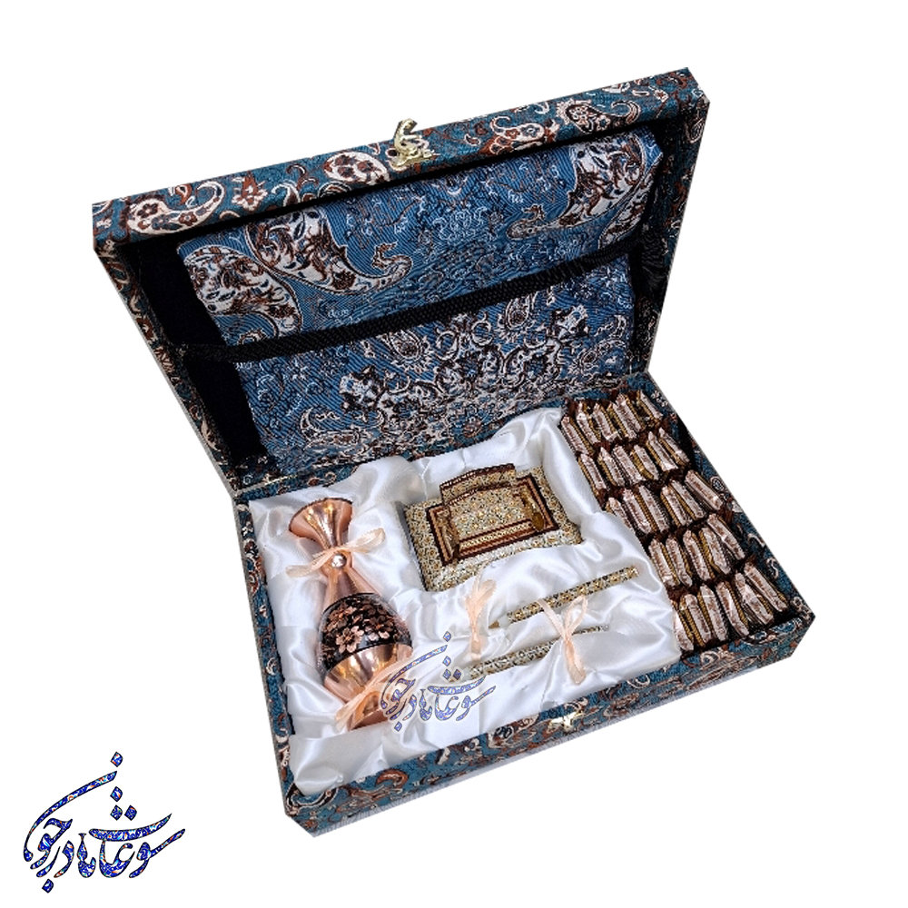 تمامی این محصولات داخل یک باکس شکیل با روکش پارچه سنتی قرار گرفته اند که جلوه ای لوکس و رسمی به هدیه می دهد.